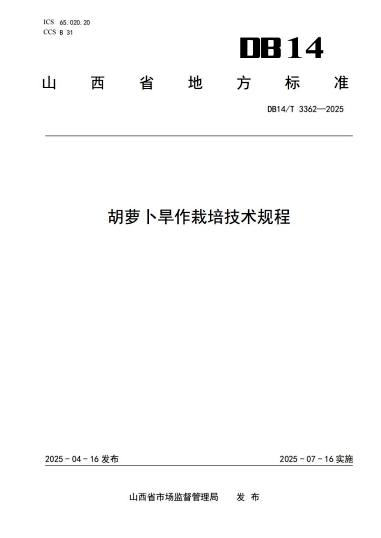 2025年4月16日,山西省市场监管局发布2025年第8号公告,山西荣辉农耕农业股份有限公司主持起草,0638太阳集团官网0638太阳集团官网、运城市农业农村局和山西运城农业职业技术学院等单位参与制定的《胡萝卜旱作栽培技术规程》DB14/3362-2025,《黄桃栽培技术规程》DB14/3374-2025和《山楂栽培质量控制技术规范》DB14/3375-2025三项省级地方标准获批发布,自2025年7月16日起实施。